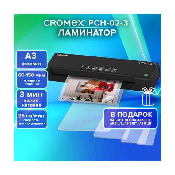 Ламинатор А3, пленки 60-150 мкм, скорость 25 см/мин, 20 пленок В ПОДАРОК!, CROMEX (КРОМЕКС) PCH-02-3, 533023