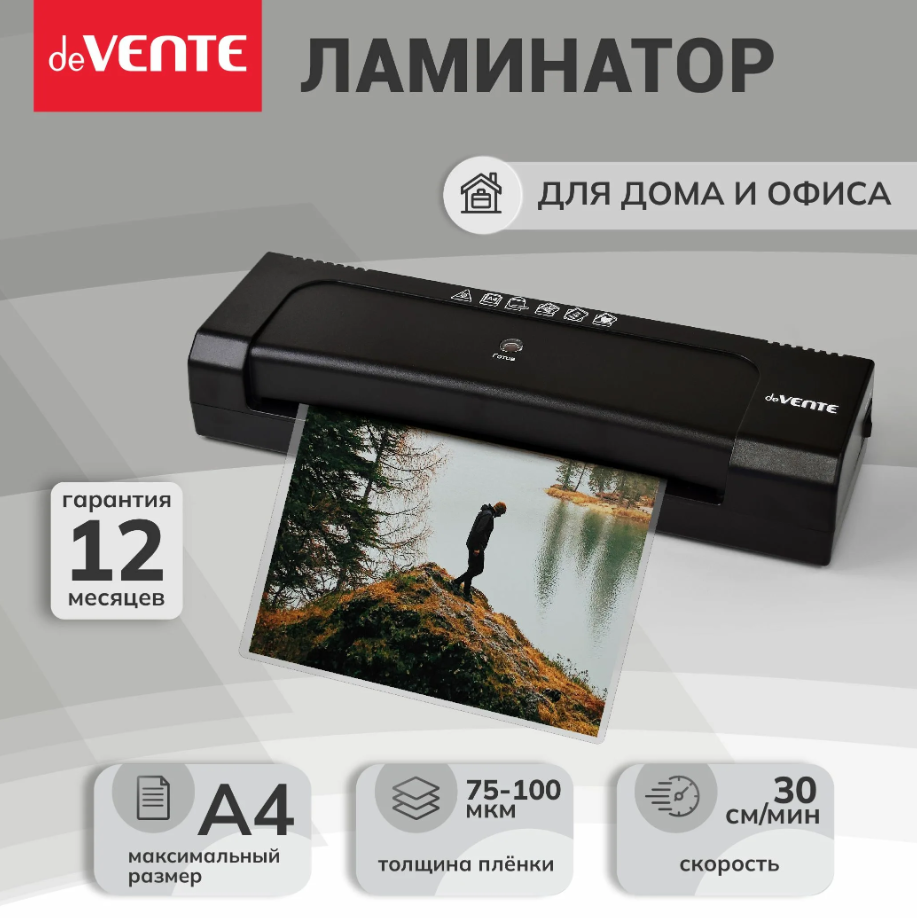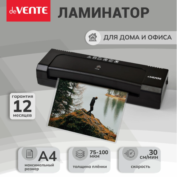 Ламинатор A4 DV768 "deVENTE" (338x100x61,5 мм) для горячего ламинирования, для пакетных пленок толщиной 75-100 мкм, максимальная ширина пленки 230 мм, максимальная толщина готового документа 0,5 мм, скорость ламинирования 30 см/мин, время разогрева 2-4 мин, защита от перегрева, гарантия 12 мес, индивидуальная упаковка