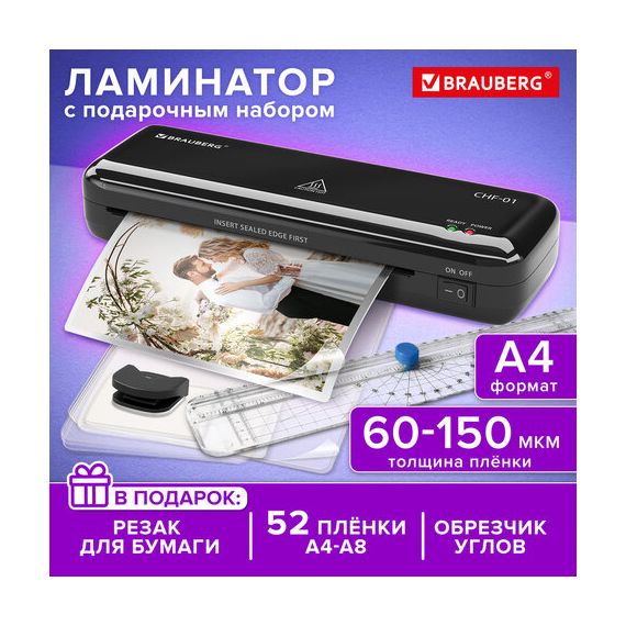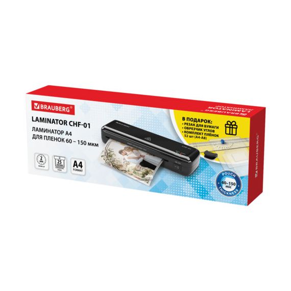 Ламинатор BRAUBERG CHF-01 А4, 60-150 мкм, 25 см/мин, с подарочным набором для ламинирования: резак, обрезчик углов, пленка 52 шт., 532861