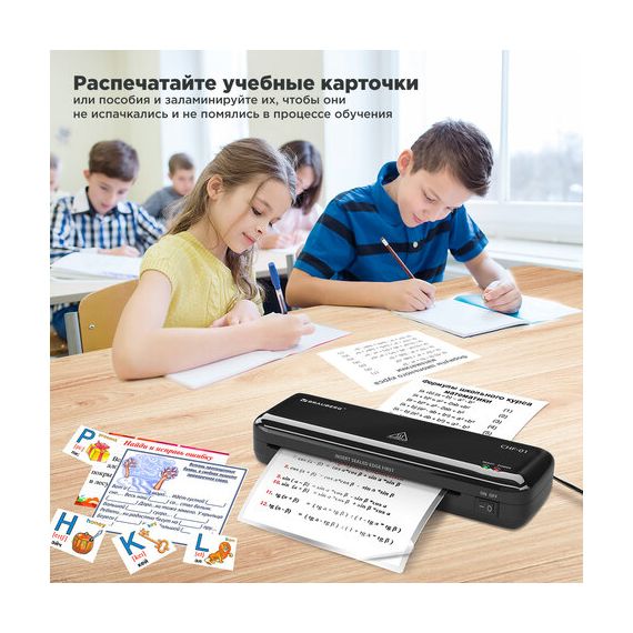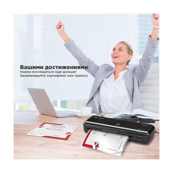 Способен заламинировать документы различных размеров – от визитки до листа формата А4. Ламинирует 1 документ формата А4 в пакетах толщиной 2х60, 2x75, 2x80, 2x100, 2х125 и 2х150 мкм за 1 минуту.