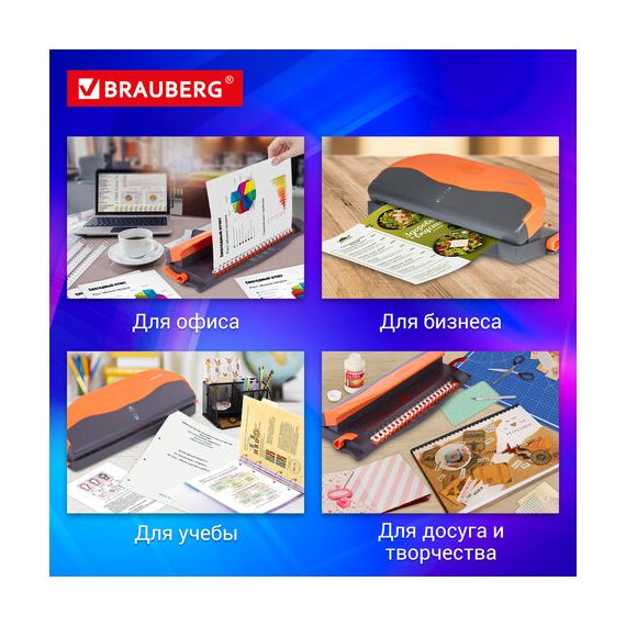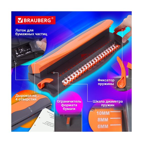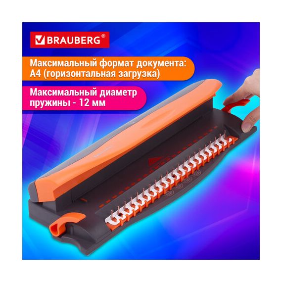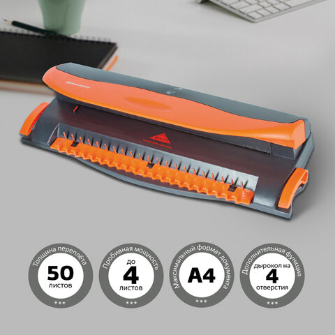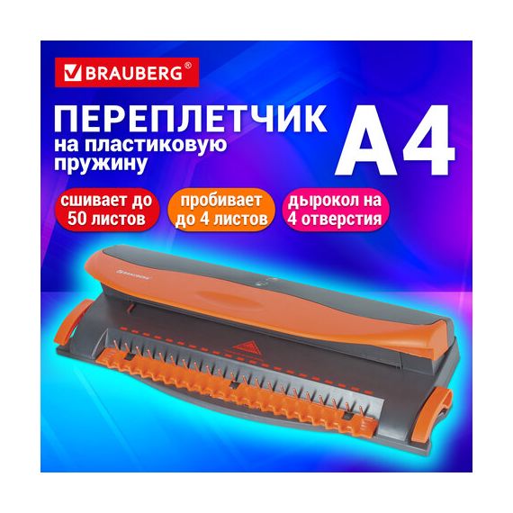 Переплетная машина для пластиковой пружины BRAUBERG BM-4, + ДЫРОКОЛ на 4 отверстия, пробивает 4 л., сшивает до 50 л., 531585