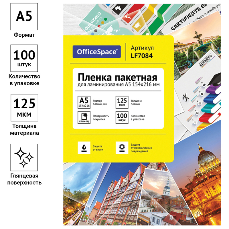 Глянцевая пакетная пленка OfficeSpace формата А5, размером 154*216 мм и толщиной 125 мкм прекрасно подходит для ламинирования документов. Она предназначена для использования в ламинаторах «горячего» типа. В упаковке 100 листов.