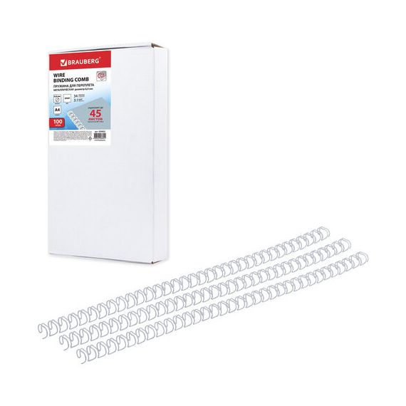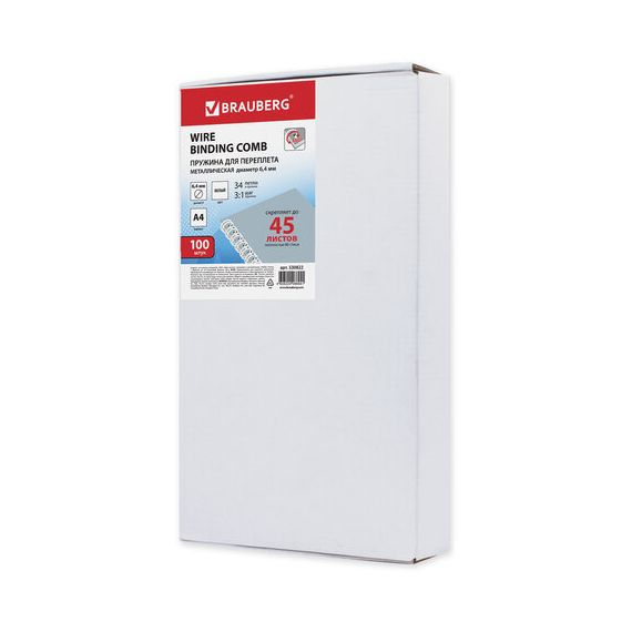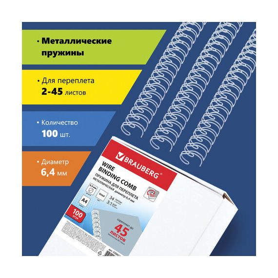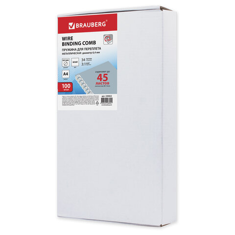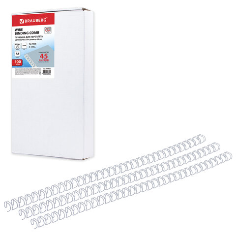 Пружины металлические для переплета, КОМПЛЕКТ 100 шт., 6,4 мм (для сшивания 2-45 л.), белые, BRAUBERG, 530822
