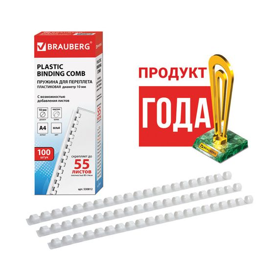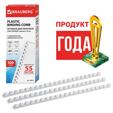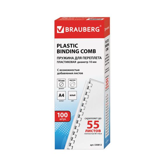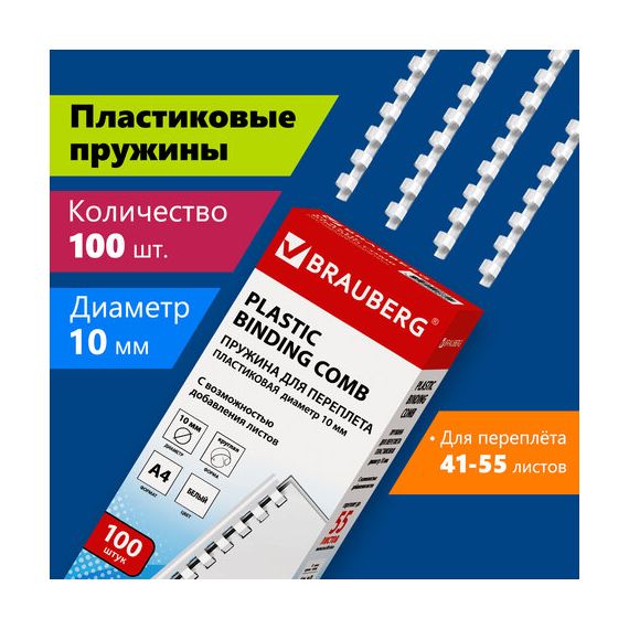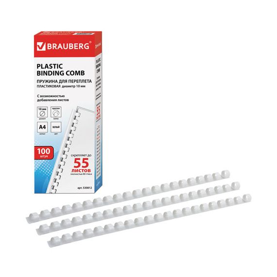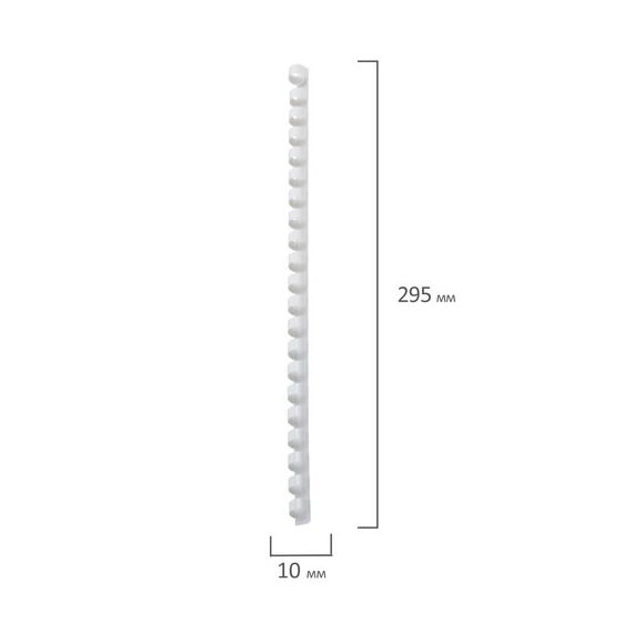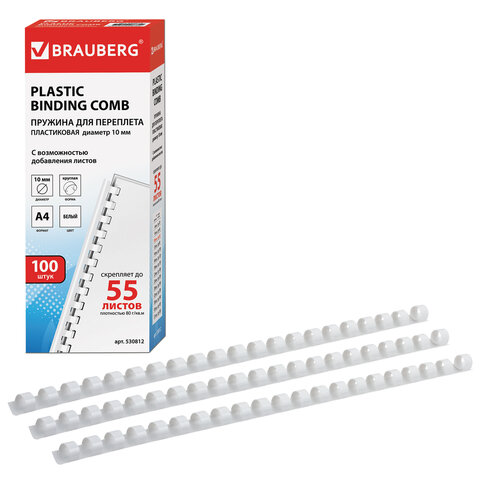 Пружины пластиковые для переплета, КОМПЛЕКТ 100 шт., 10 мм (для сшивания 41-55 л.), белые, BRAUBERG, 530812