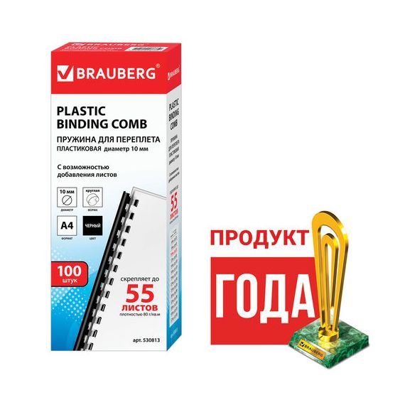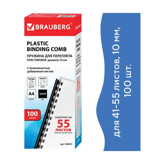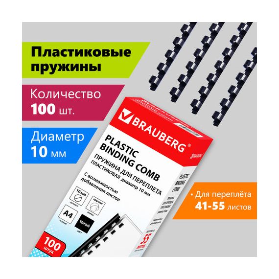 Пружины пластиковые для переплета, КОМПЛЕКТ 100 шт., 10 мм (для сшивания 41-55 л.), черные, BRAUBERG, 530813