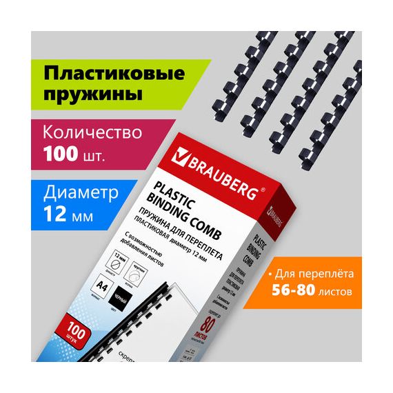 Пружины пластиковые для переплета, КОМПЛЕКТ 100 шт., 12 мм (для сшивания 56-80 л.), черные, BRAUBER