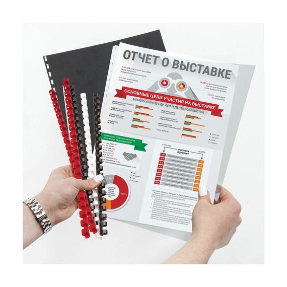 Рекомендуется использовать для переплета документов объемом от 56 до 80 листов. Изготовлена из высококачественного пластика чёрного цвета. Состоит из 21 кольца диаметром 12 мм. В упаковке 100 штук.