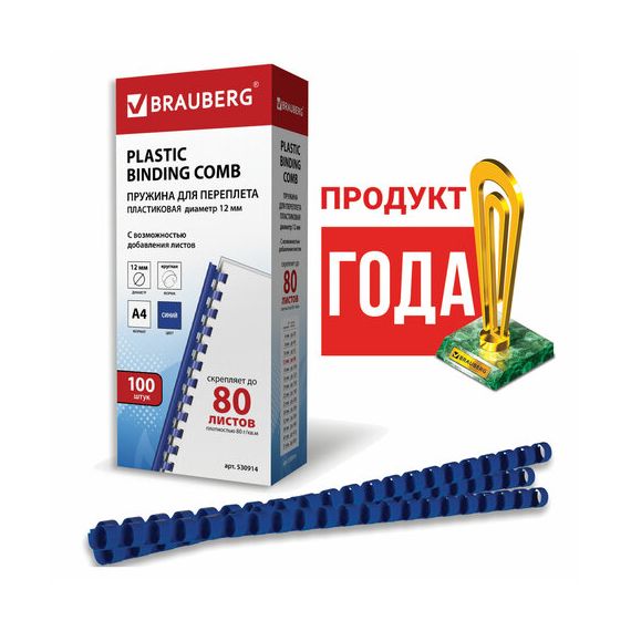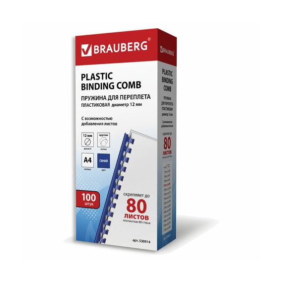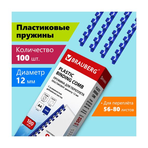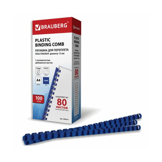 Пружины пластиковые для переплета, КОМПЛЕКТ 100 шт., 12 мм (для сшивания 56-80 л.), синие, BRAUBERG, 530914