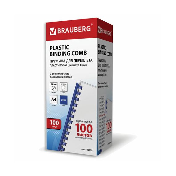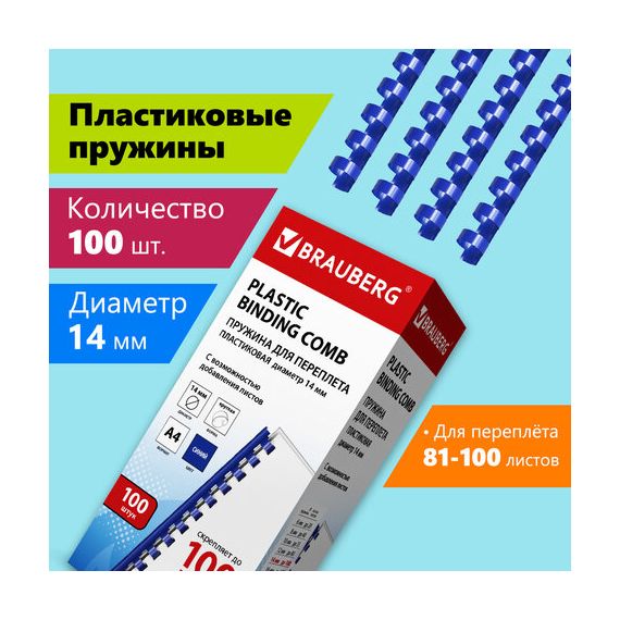 Пружины пластиковые для переплета, КОМПЛЕКТ 100 шт., 14 мм (для сшивания 81-100 л.), синие, BRAUBERG, 530919