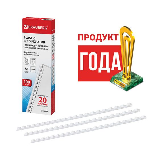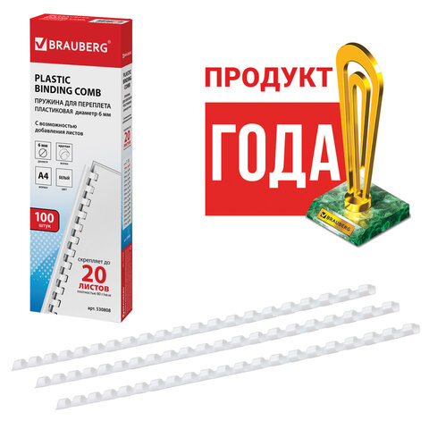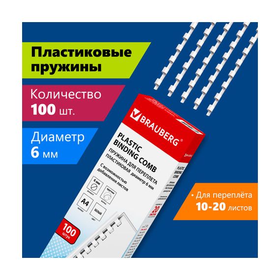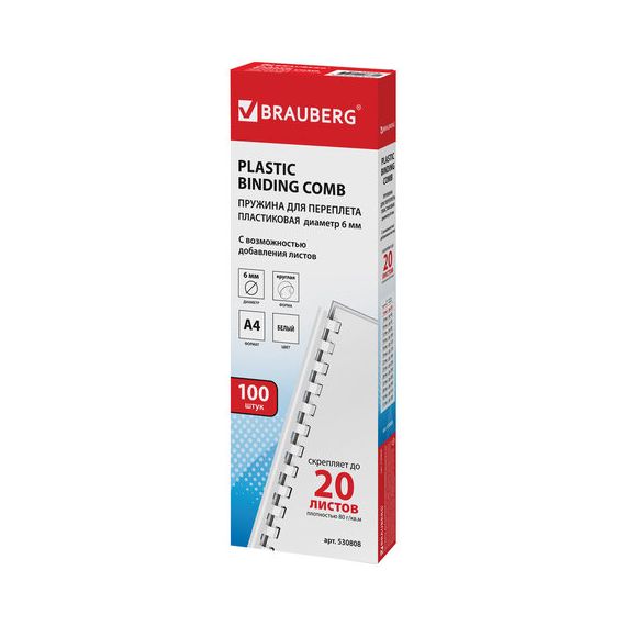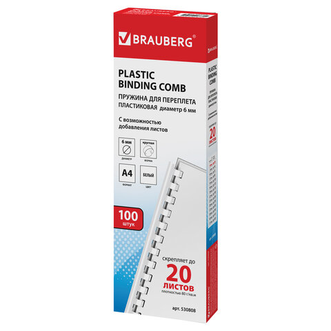 Пружины пластиковые для переплета, КОМПЛЕКТ 100 шт., 6 мм (для сшивания 10-20 л.), белые, BRAUBERG, 530808