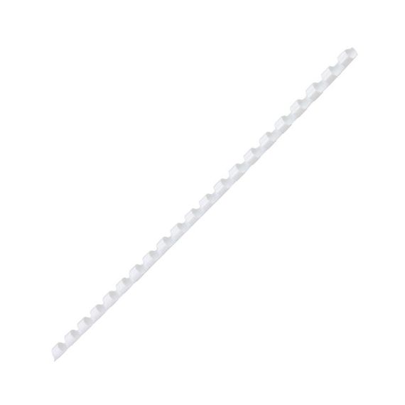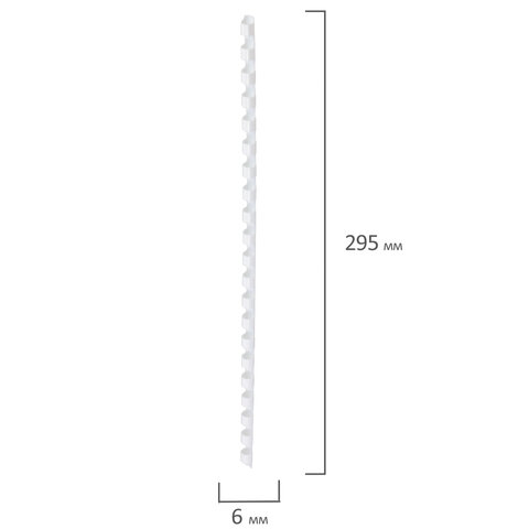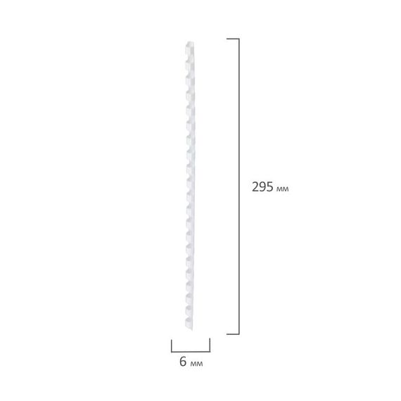 Рекомендуется использовать для переплета документов объемом от 10 до 20 листов. Изготовлена из высококачественного пластика белого цвета. Состоит из 21 кольца диаметром 6 мм. В упаковке 100 штук.