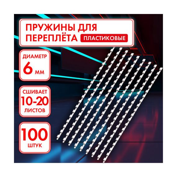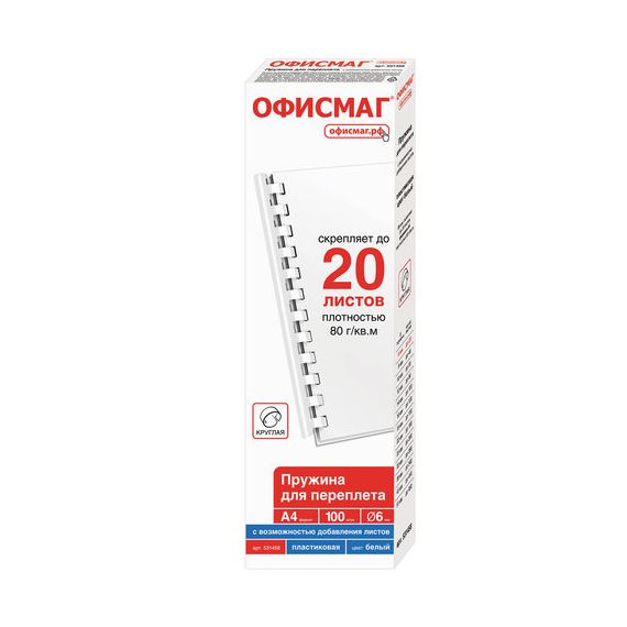 Пружины пластиковые для переплета, КОМПЛЕКТ 100 шт., 6 мм (для сшивания 10-20 л.), белые, ОФИСМАГ, 531458