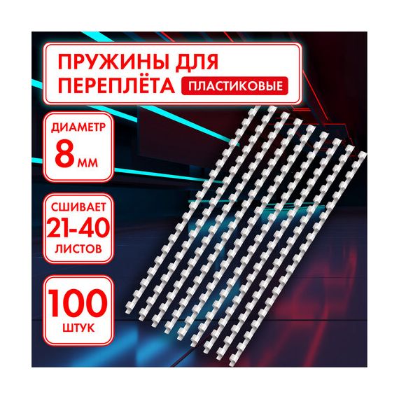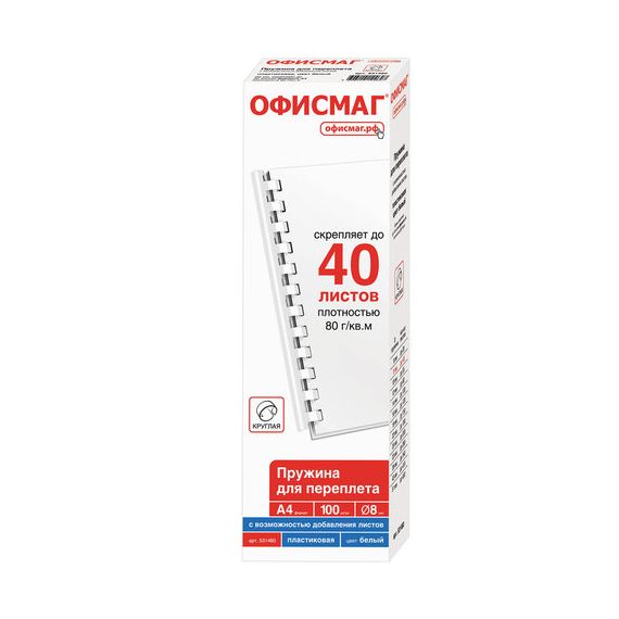 Пружины пластиковые для переплета, КОМПЛЕКТ 100 шт., 8 мм (для сшивания 21-40 л.), белые, ОФИСМАГ, 531460