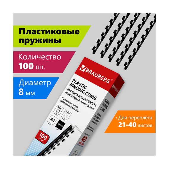 Пружины пластиковые для переплета, КОМПЛЕКТ 100 шт., 8 мм (для сшивания 21-40 л.), черные, BRAUBERG