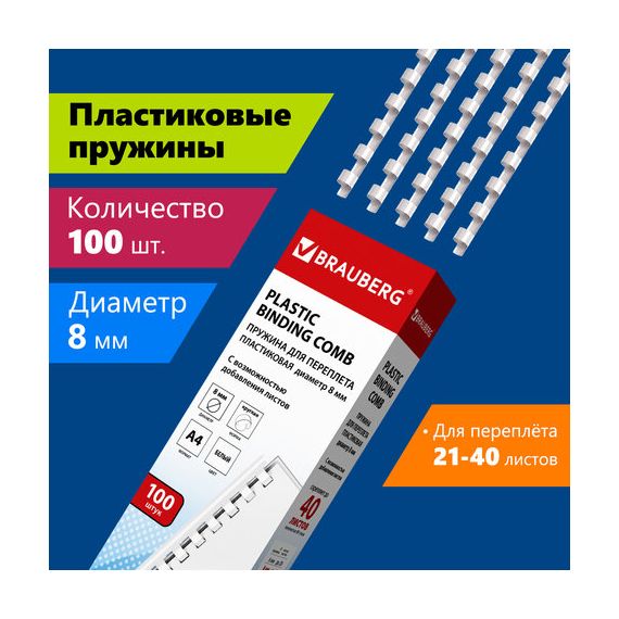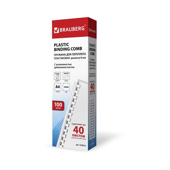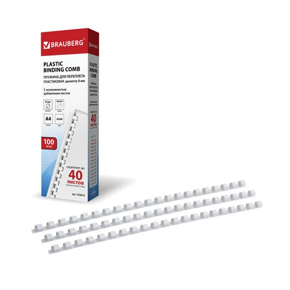 Пружины пластиковые для переплета, КОМПЛЕКТ 100 штук, 8 мм (для сшивания 21-40 листов), белые, BRAUBERG, 530810