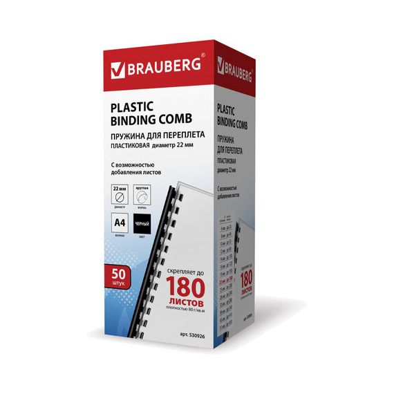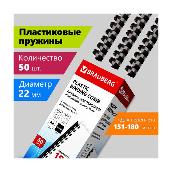 Пружины пластиковые для переплета, КОМПЛЕКТ 50 шт., 22 мм (для сшивания 151-180 л.), черные, BRAUBERG, 530926