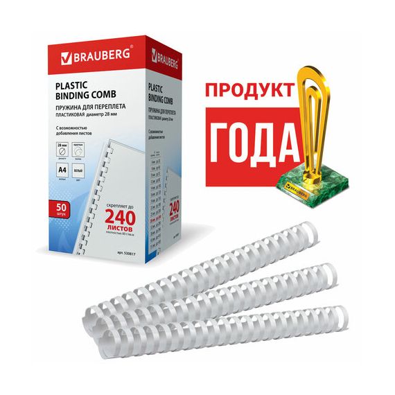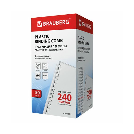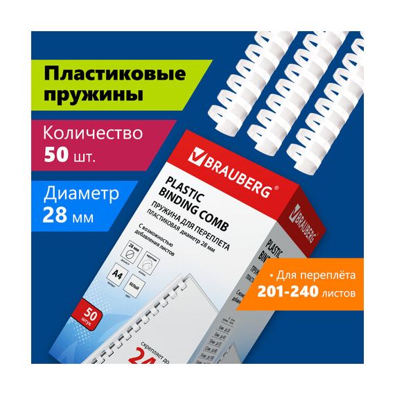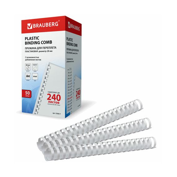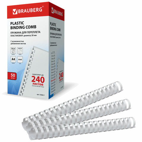 Пружины пластиковые для переплета, КОМПЛЕКТ 50 шт., 28 мм (для сшивания 201-240 л.), белые, BRAUBERG, 530817
