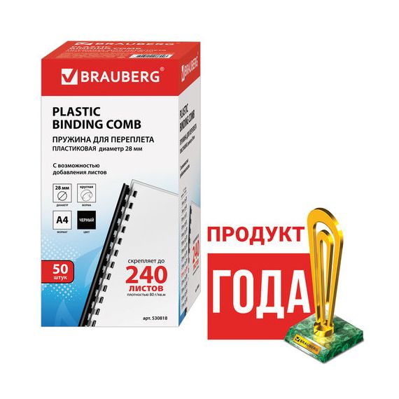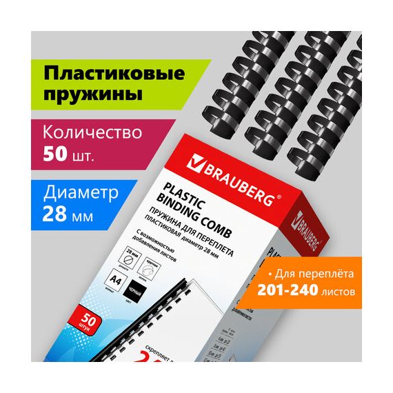 Пружины пластиковые для переплета, КОМПЛЕКТ 50 шт., 28 мм (для сшивания 201-240 л.), черные, BRAUBERG, 530818