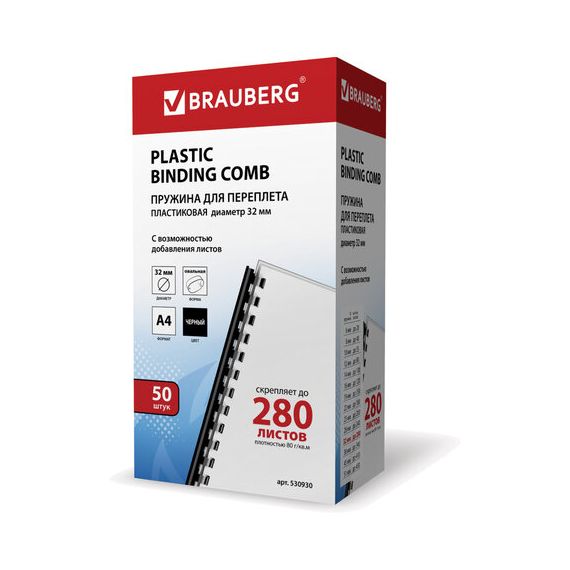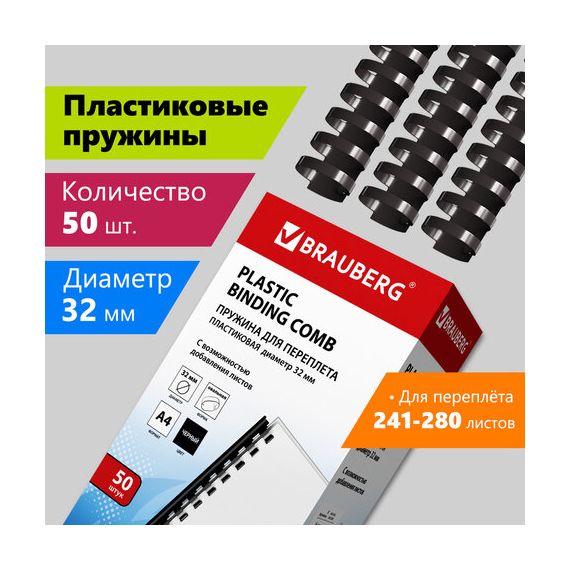 Пружины пластиковые для переплета, КОМПЛЕКТ 50 шт., 32 мм (для сшивания 241-280 л.), черные, BRAUBERG, 530930