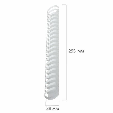 Рекомендуется использовать для переплета документов объемом от 281 до 340 листов. Изготовлена из высококачественного пластика белого цвета. Состоит из 21 кольца диаметром 38 мм. В упаковке 50 штук.