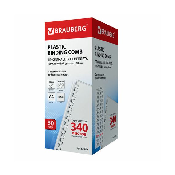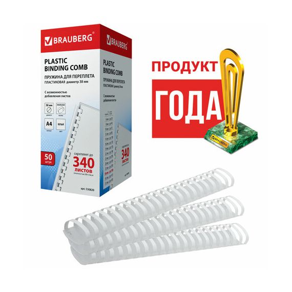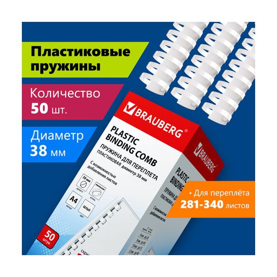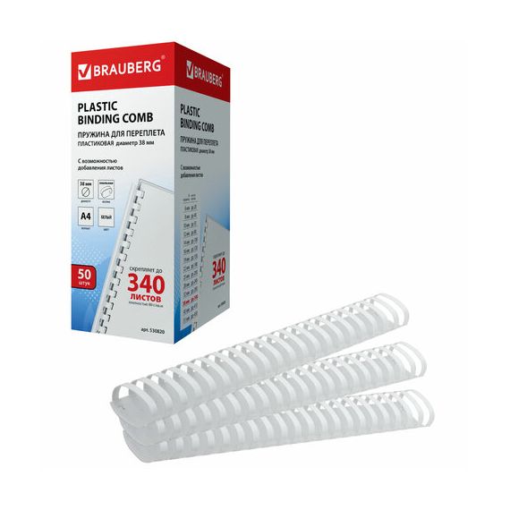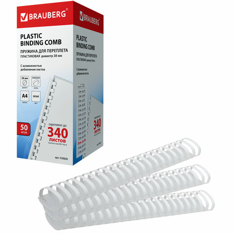 Пружины пластиковые для переплета, КОМПЛЕКТ 50 шт., 38 мм (для сшивания 281-340 л.), белые, BRAUBERG, 530820