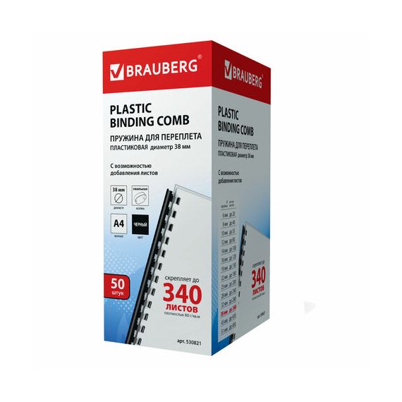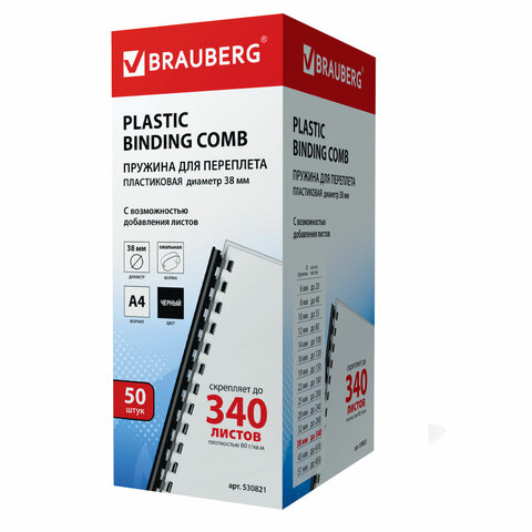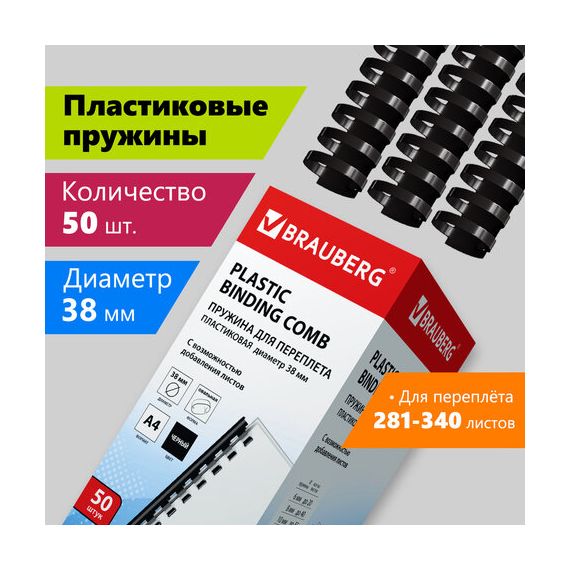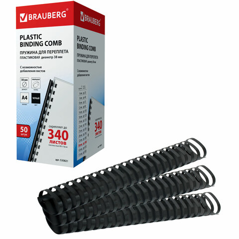 Пружины пластиковые для переплета, КОМПЛЕКТ 50 шт., 38 мм (для сшивания 281-340 л.), черные, BRAUBERG, 530821