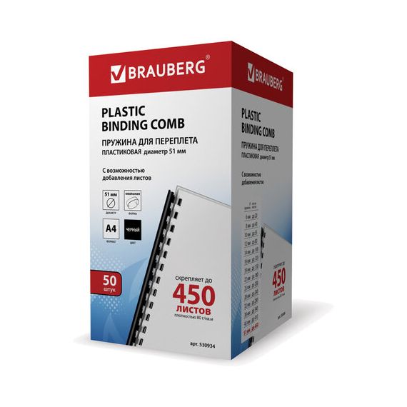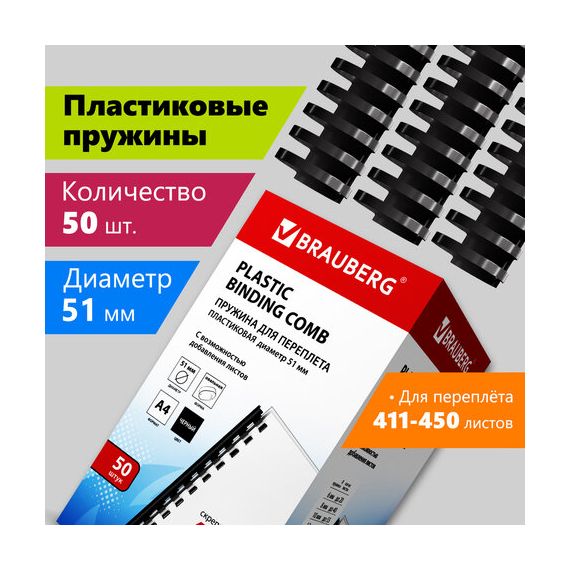 Пружины пластиковые для переплета, КОМПЛЕКТ 50 шт., 51 мм (для сшивания 411-450 л.), черные, BRAUBERG, 530934