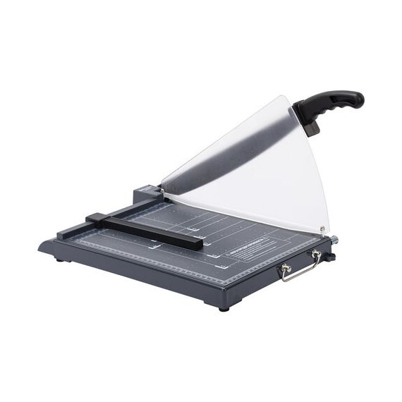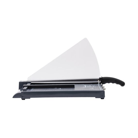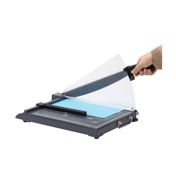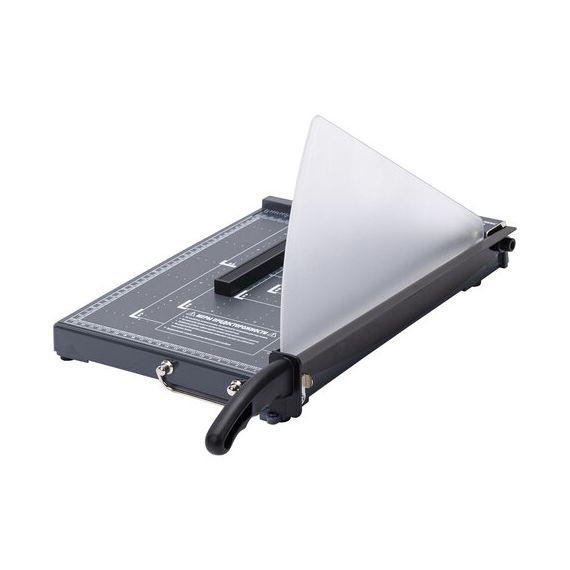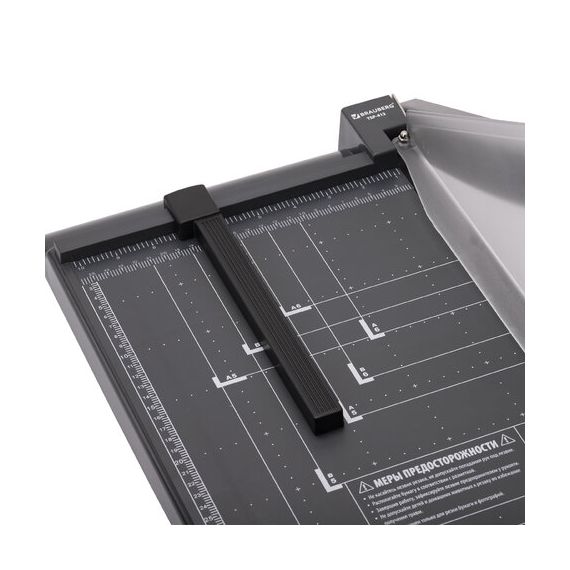 Оснащен безопасным лезвием, регулируемым пластиковым упором и прижимом для бумаг. Рукоятка анатомической формы препятствует соскальзыванию руки, а специальное крепление для рукояти зафиксирует её в закрытом положении и предотвратит непреднамеренное поднятие. Удобная разметка рабочей поверхности позволяет точно наметить линию реза.