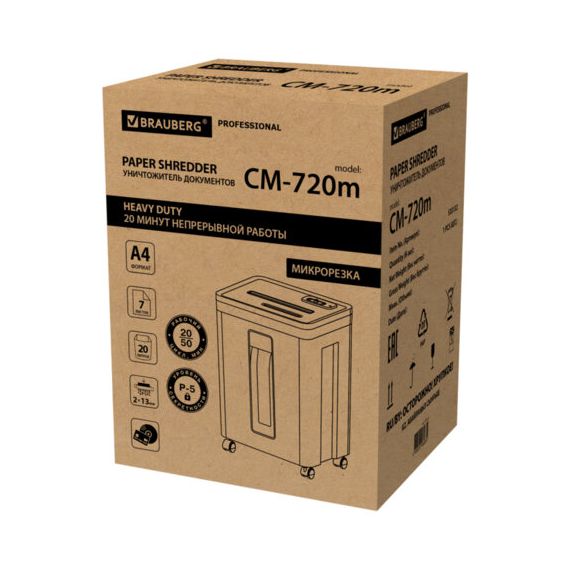 Уничтожитель (шредер) BRAUBERG PROFESSIONAL CM-720m, "Heavy Duty", 5 уровень секретности, 2х13 мм, 7 листов, корзина 20 литров, 533132