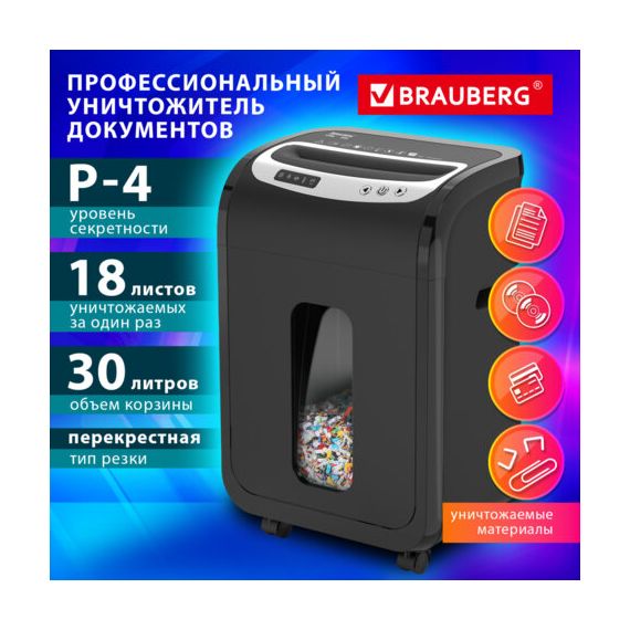 Уничтожитель (шредер) BRAUBERG PROFESSIONAL OF-1830x, HeavyDuty, CD, карты, 4 уровень секретности, 4х38 мм, 18 листов, 30 литров, 533140