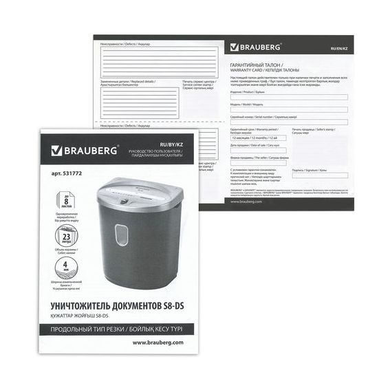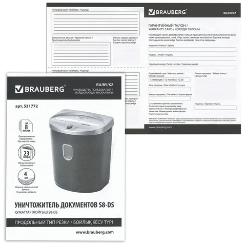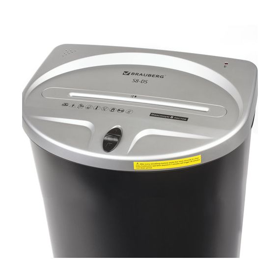 Уничтожитель (шредер) BRAUBERG S8-DS, 2 уровень секретности, полоски 4 мм, 8 листов, корзина 23 литра, 531772