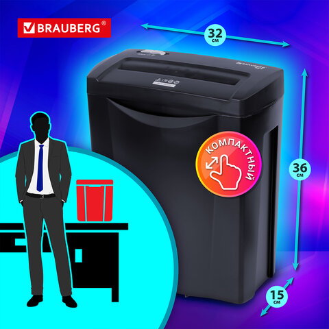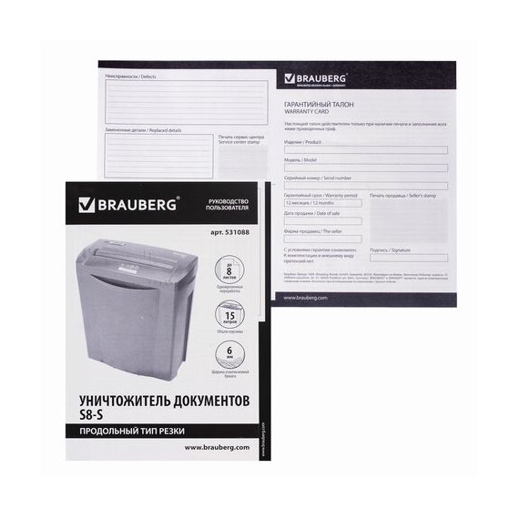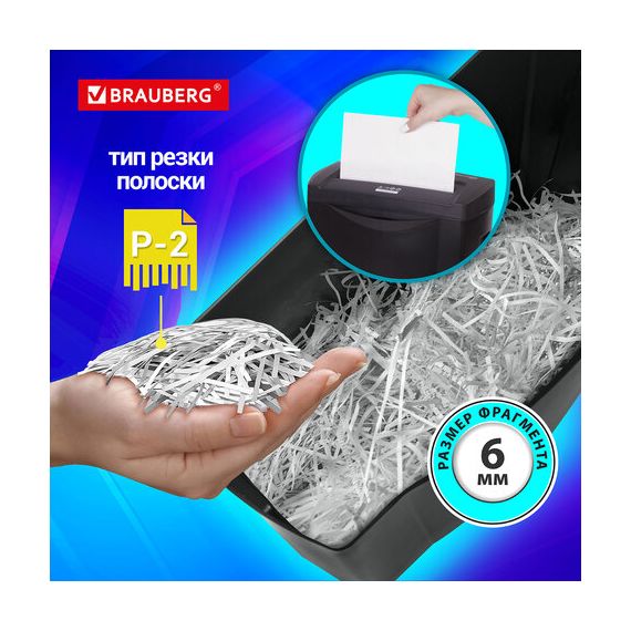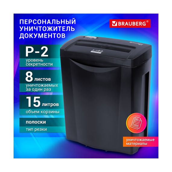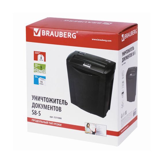 Уничтожитель (шредер) BRAUBERG S8-S, 2 уровень секретности, полоски 6 мм, 8 листов, корзина 15 литров, 531088