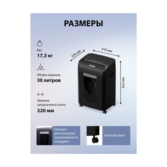Резка выполняется перекрестным способом, превращая документы в мелкие фрагменты, которые невозможно восстановить. Это гарантирует максимальную защиту конфиденциальной информации. Вместительная корзина объемом 30 литров сокращает частоту очистки, повышая удобство использования.