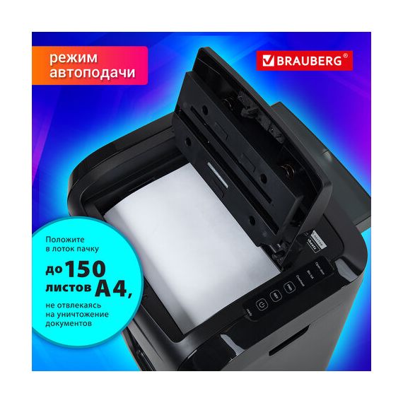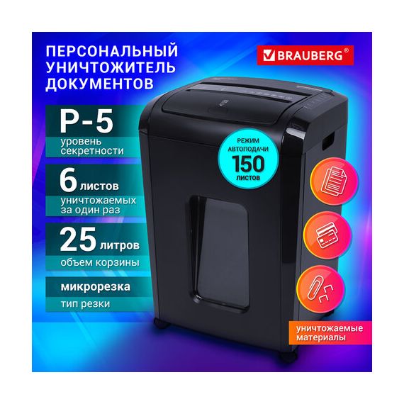Уничтожитель (шредер) с автоподачей BRAUBERG AUTO 150M, 5 уровень секретности, 6 листов, корзина 25 литров, 532155