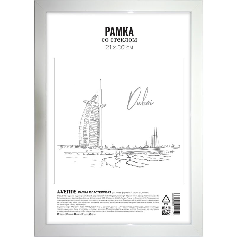 Рамка пластиковая "deVENTE" 21x30 см, формат A4, серия 6/1 (багет 15 x 12,4 мм) стекло, задняя панель - переплетный картон, с креплением для подвеса, белая, в термоусадочной пленке