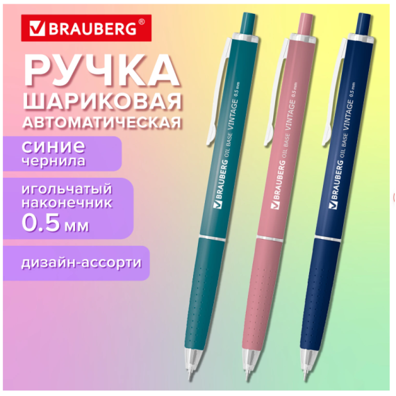 Автоматическая шариковая ручка BRAUBERG "OIL-BASE VINTAGE", элегантная модель доступна в трёх пастельных цветах: темно-синий, бирюзовый и пыльно розовый – идеальные глубокие цвета для тех, кто ценит изящность и индивидуальность. Мягкий soft-touch корпус и прорезиненная рукоять обеспечивают комфортное и надежное держание даже во время длительного письма. Благодаря инновационной масляной технологии чернил, вы получите исключительно плавное и мягкое письмо без усилий. Тонкий игольчатый наконечник диаметром 0,5 мм оставляет изящную линию шириной всего 0,3 мм, позволяя создавать точные и аккуратные записи.