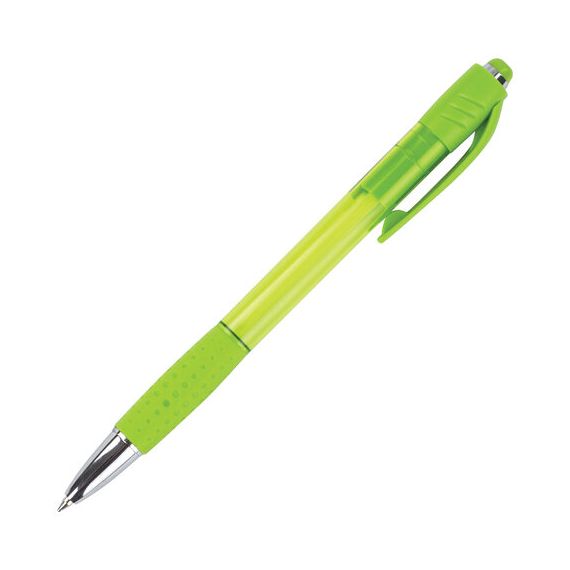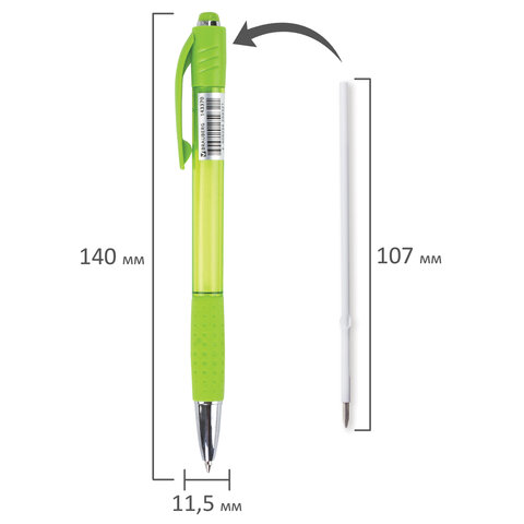 Укомплектована стержнем со стандартным наконечником, заправленным чернилами синего цвета. Длина сменного стержня - 107 мм. Диаметр пишущего узла 0,7 мм создает линию письма, равную 0,35 мм. Круглый корпус зеленого цвета и хромированные детали.