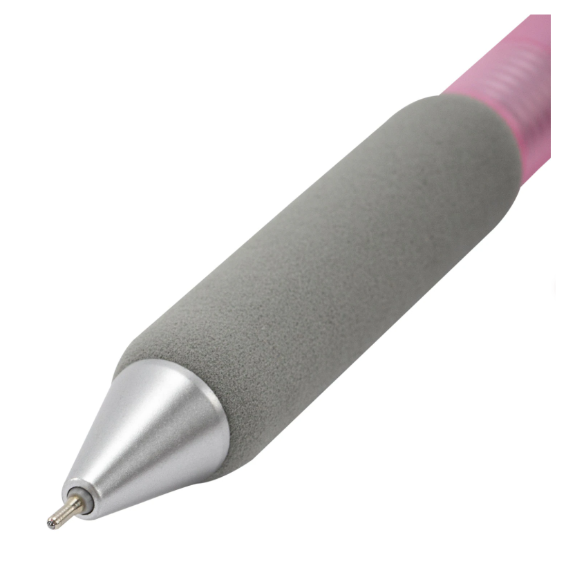 Тонированный корпус ручки представлен в двух цветах: розовый и серый (ассорти без возможности выбора). Необычный и современный дизайн достигается за счет металлического клипа и увеличенного в размерах мягкого грипа. Шариковый игольчатый узел диаметром 0,5 мм позволяет создать линию письма 0,35 мм.
