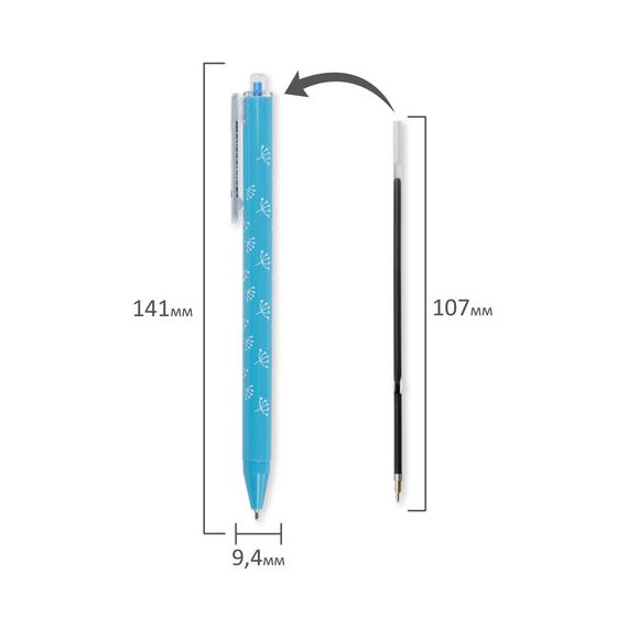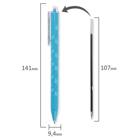Имеет круглый корпус из ассорти цветов с печатью на корпусе. Сменный стержень длиной 107 мм с игольчатым наконечником позволит использовать ручку максимально долго. Диаметр пишущего узла, равный 0,7 мм, создает тонкую линию письма, равную 0,35 мм. Специальные масляные чернила синего цвета ультрапониженной вязкости и надежный пишущий узел обеспечивают непревзойденно мягкое и комфортное письмо.