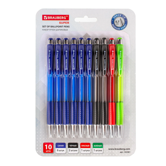 Ручки шариковые автоматические с грипом "НАБОР MULTICOLOR" BRAUBERG "SUPER", 10 шт. (6 синих, 2 черн