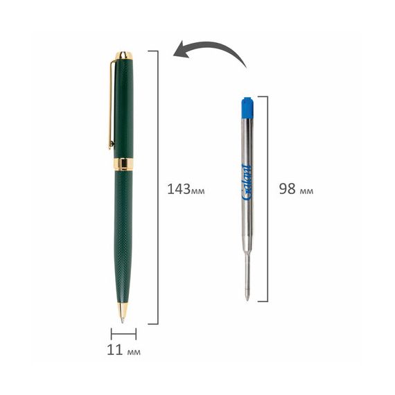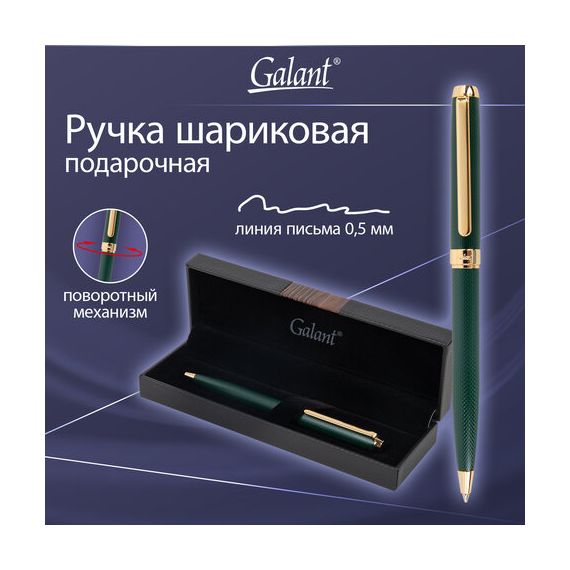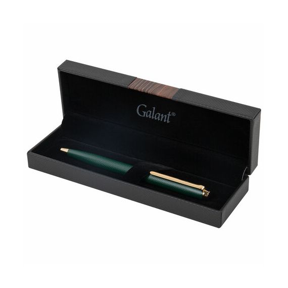 Корпус покрыт гравировкой и увеличивается к торцевой части. Клип позволяет фиксировать ручку на ежедневниках, блокнотах и карманах одежды. GALANT "Ando Emerald" оснащена поворотным механизмом, внутри которого расположен стержень. Диаметр наконечника составляет 0,7 мм, то есть ручка идеально подходит для быстрого стиля письма. Упакована в подарочный футляр.