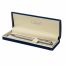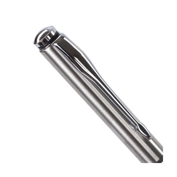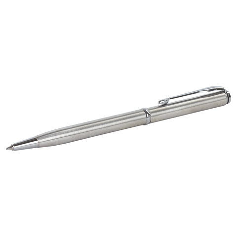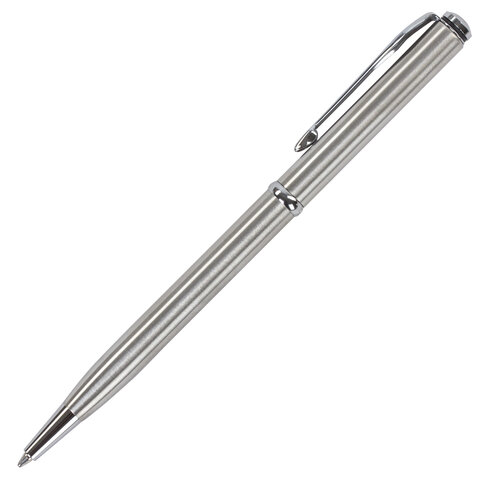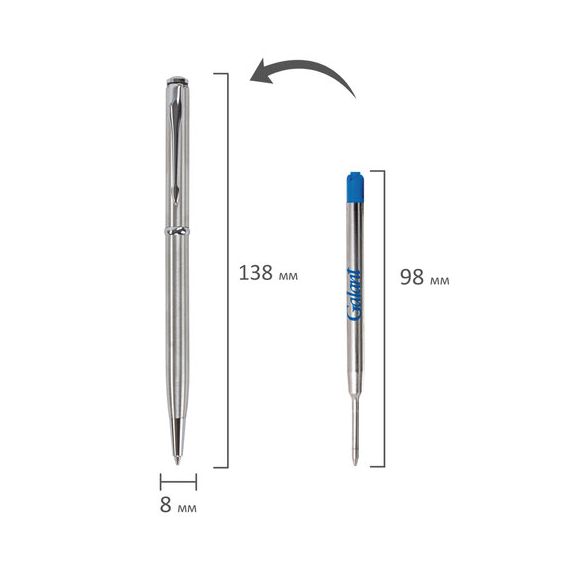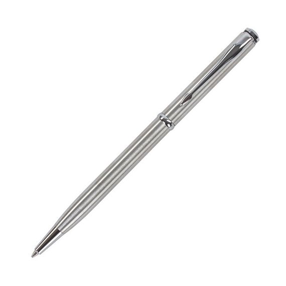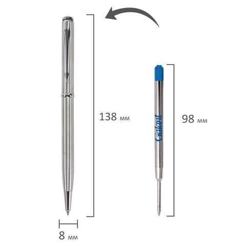 Элегантная тонкая модель ручки с корпусом из латуни серебристого цвета и хромированными деталями прекрасно лежит в руке и не скользит. Синий цвет чернил, длина стержня составляет 98 мм, а диаметр пишущего узла - 0,7 мм. Поставляется в индивидуальном подарочном футляре. Подходит для гравировки.
