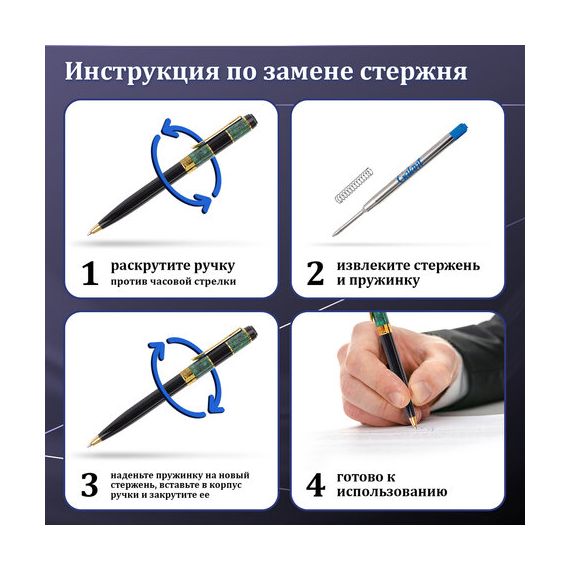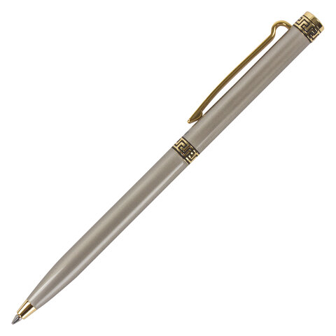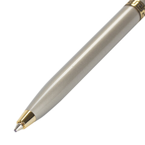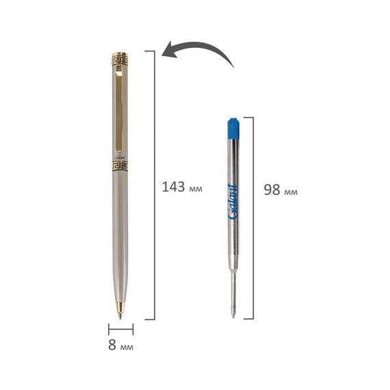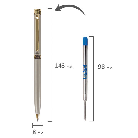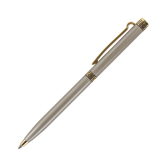 Корпус ручки серебристого цвета выполнен из латуни и украшен узорчатыми деталями. Синий цвет чернил, длина стержня составляет 98 мм, а диаметр пишущего узла - 0,7 мм. Поставляется в индивидуальном подарочном футляре. Подходит для гравировки.