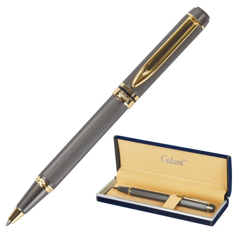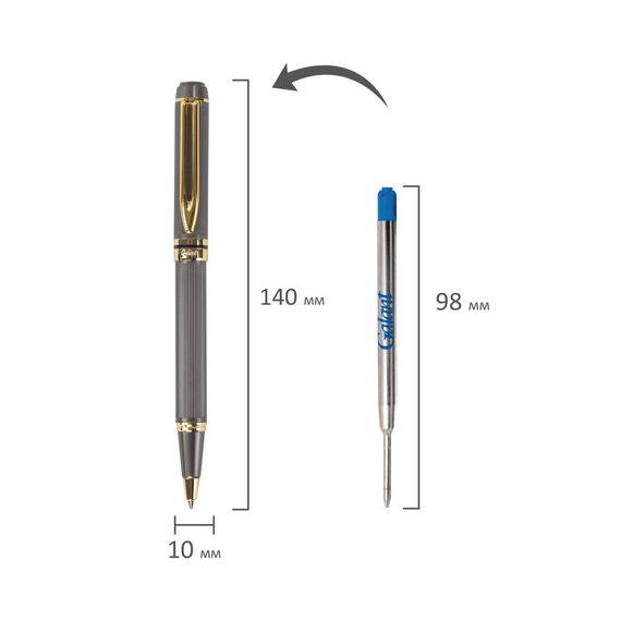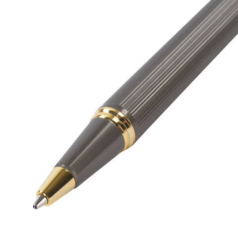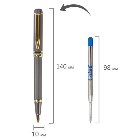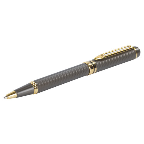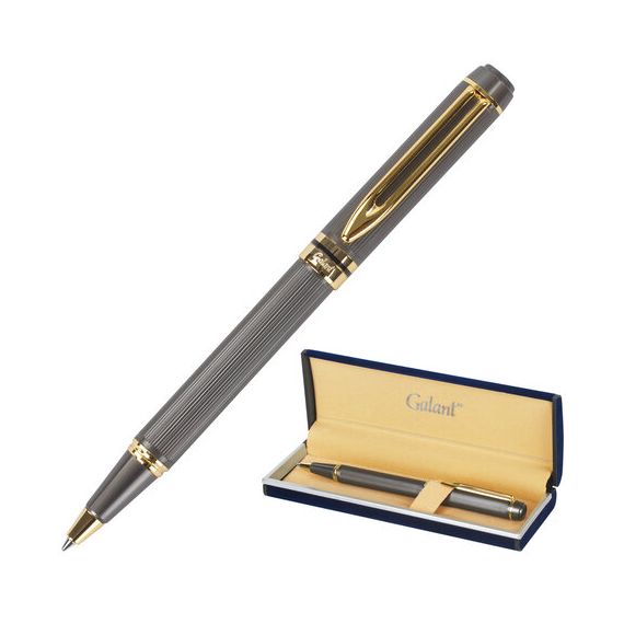 Корпус ручки матового серого цвета выполнен из латуни и декорирован позолоченными деталями. Синий цвет чернил, длина стержня составляет 98 мм, а диаметр пишущего узла - 0,7 мм. Поставляется в индивидуальном подарочном футляре. Подходит для гравировки.