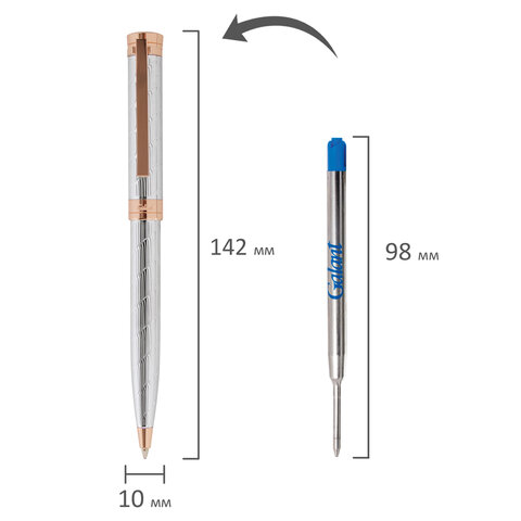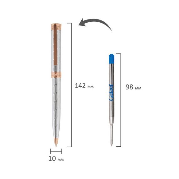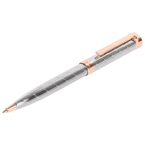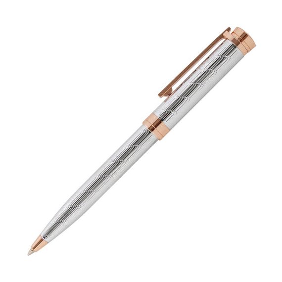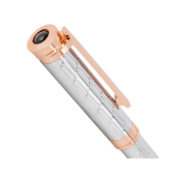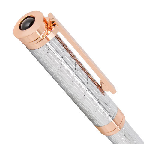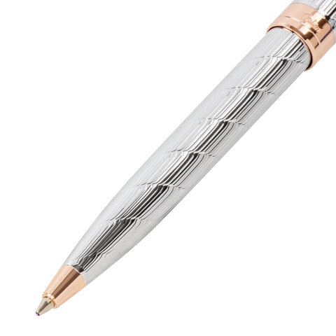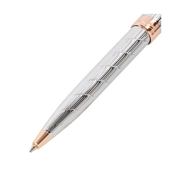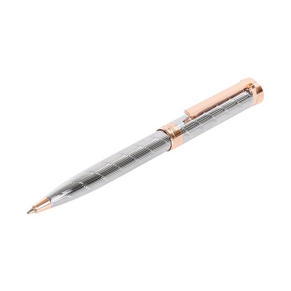 Утонченная модель ручки с корпусом из латуни серебристого цвета, золотыми деталями и декоративным узором прекрасно лежит в руке. Синий цвет чернил; длина стержня составляет 98 мм, а диаметр пишущего узла - 0,7 мм. Поставляется в индивидуальном подарочном футляре. Подходит для гравировки.