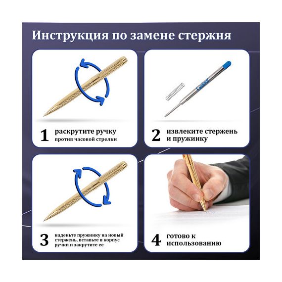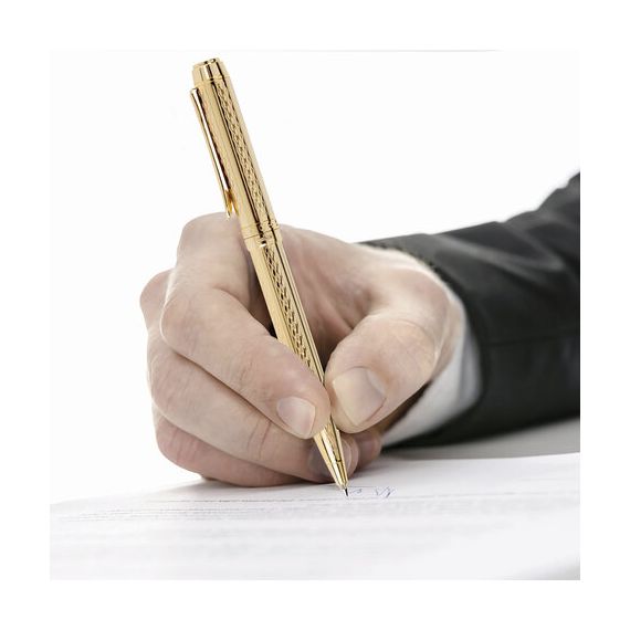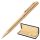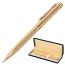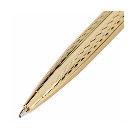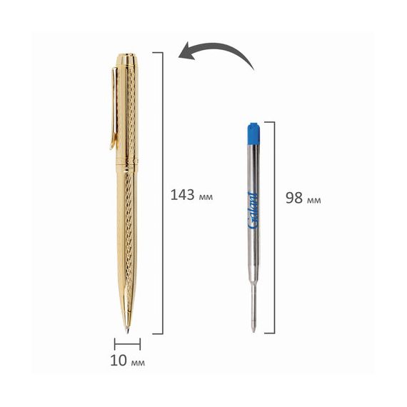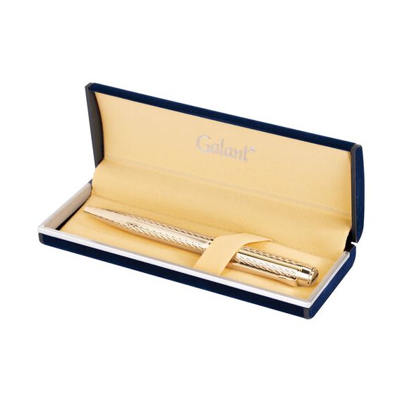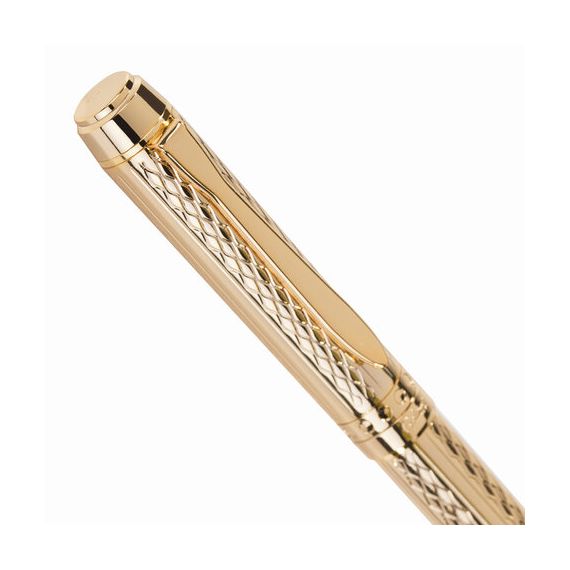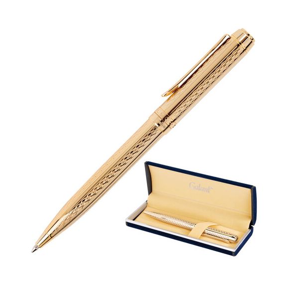 Корпус ручки золотистого цвета выполнен из латуни и декорирован золотистой гравировкой. Синий цвет чернил, длина стержня составляет 98 мм, а диаметр пишущего узла - 0,7 мм. Поставляется в индивидуальном подарочном футляре. Подходит для гравировки.