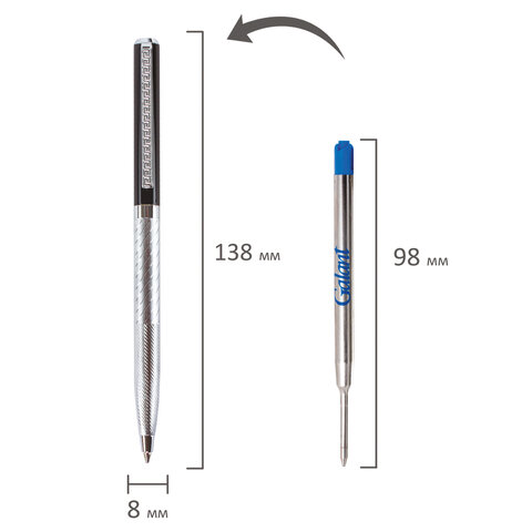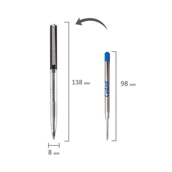 Корпус ручки серебристого цвета выполнен из латуни. Синий цвет чернил, длина стержня составляет 98 мм, а диаметр пишущего узла - 0,7 мм. Поставляется в индивидуальном подарочном футляре. Подходит для гравировки.