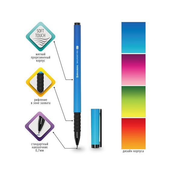 Ручка шариковая BRAUBERG SOFT TOUCH GRIP "GRADE NEON", СИНЯЯ, мягкое покрытие, ассорти, узел 0,7 мм,