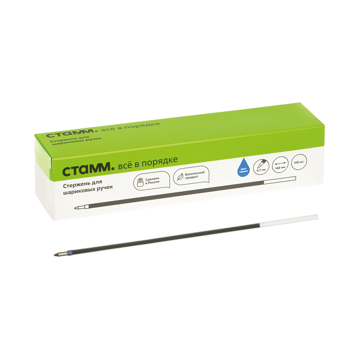 Стержень шариковый «СТАММ» предназначен для замены исписанного стержня шариковой ручки. Толщина линии – 0,5 мм, диаметр пишущего узла – 0,7 мм. Длина стержня – 140 мм. Синие чернила пониженной вязкости на масляной основе обеспечивают мягкое и плавное письмо, не текут и не мажутся. Износостойкий наконечник и большой запас чернил позволяют долго использовать ручку для ведения записей. Длина линии письма в два раза больше стандартной – 1 500 м. В картонной упаковке – сто стержней.