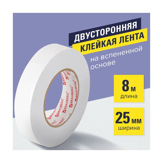 Клейкая двухсторонняя лента 25 мм х 8 м, НА ВСПЕНЕННОЙ ОСНОВЕ, 1 мм, прочная, BRAUBERG